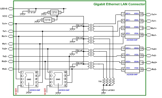 針對以太網(wǎng)絡接口,晶焱科技提供完整的雷擊與ESD防護方案。AZ3028-04P于一次測提供線對線的雷擊防護,AZ3025-04F于二次測提供線對線的雷擊防護,AZ3133-04F于二次測提供線對地的雷擊防護,并能夠有效防護ESD的沖擊。圖一為利用AZ3028-04P與AZ3133-04F防護以太網(wǎng)絡接口的電路圖,可通過IEC61000-4-5 10/700us線對線2kV,線對地6kV的測試規(guī)范,以及IEC61000-4-2 ESD 30kV的測試規(guī)范。